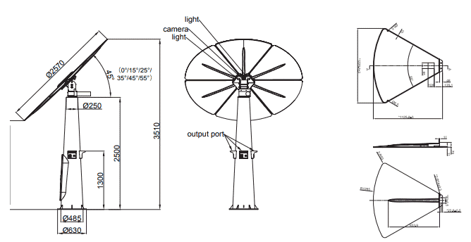 Die Solarblume IX1200 hat ein Gewicht von 350 kg. Sie misst eine maximale Höhe von 3,60 Meter und hat einen Durchmesser von 2,50 Meter.
